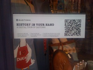 History on your phone. Gastown is leading the way with this new venture. Look for these discreet stickers in shop windows and with your code reader for your phone you snap a picture and you’re immediately taken to a history page for the building.