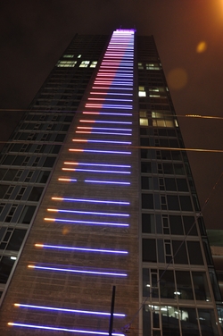 Dutch lighting artist Tamar Frank was selected to create the unique work by a jury in an international competition. Developer Reliance Properties spent its entire $400,000 budget for public art – a budget required by the city – on the two vertical columns of light.