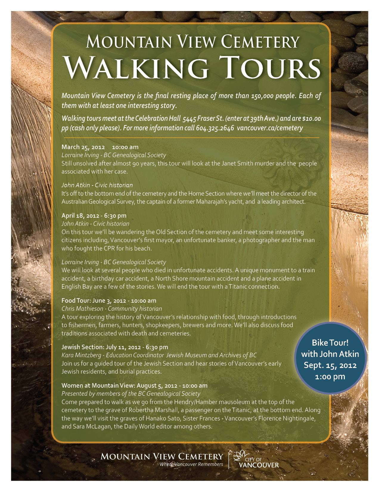 Mountain View Cemetery, Vancouver’s only cemetery has announced its 2012 walking tour dates. Check them out at vancouver.ca/cemetery
