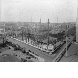 Construction progress photograph showing signs for E.J. Ryan Contracting Company and for Dominion Bridge and the roof of Wesley United Church, part of the Court House grounds and the west side of the 700 Block of Hornby Street.