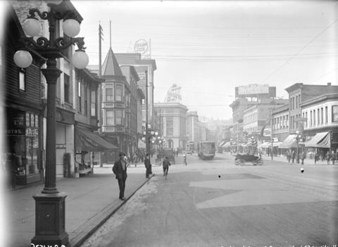 Hasting Street 1912 and the Archives photo (SGN1536) shows a busy street scene. Way in the background is this guy on his ladder repairing the illuminated sign for the Dick’s Clothing store. See this post on Changing City for more info on William Dick.