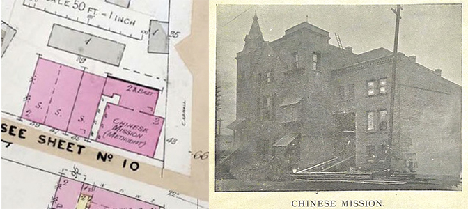 The Methodist church was the first to minister to the Chinese community in Canada, there was a mission school in 1876 in Victoria and in Vancouver in 1888. From its original Hastings Street location the Mission moved to a building on Dupont Street (Pender) in 1889. In 1900 the mission moved to a purpose built building on Carrall at Dupont Street. The illustration is one of the few that show the full building. It is from a booklet published in 1900 by the architecture firms of Parr and Fee, W. T. Dalton, R. Mackay Fripp, William Blackmore and G. W. Grant. In the booklet, Parr and Fee take credit for the design, though it may only be for the addition. Thomas Hooper receives the credit in earlier newspaper reports.