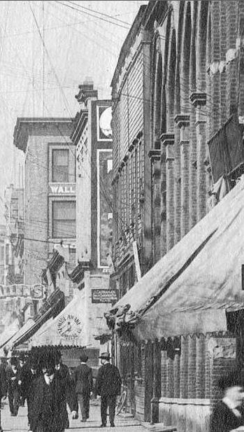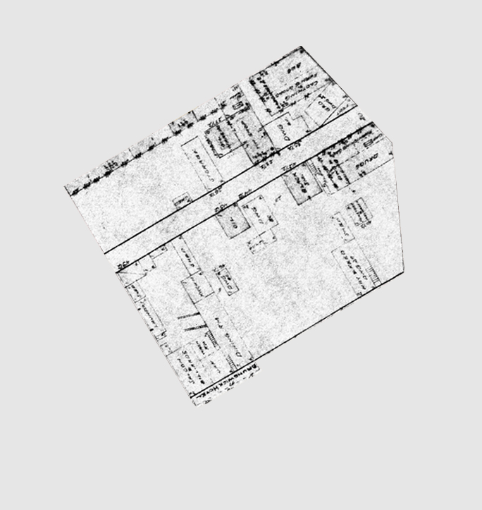 The 1912 Fire insurance map shows us where the Palace Hotel is and Wood Vallance Leggat (lot 15). The 1889 fire insurance map clearly shows the location of the Brunswick. Cut out, rotated and placed on the 1912 map, it falls squarely on lot 14 – which becomes Buscome’s and later A & N.