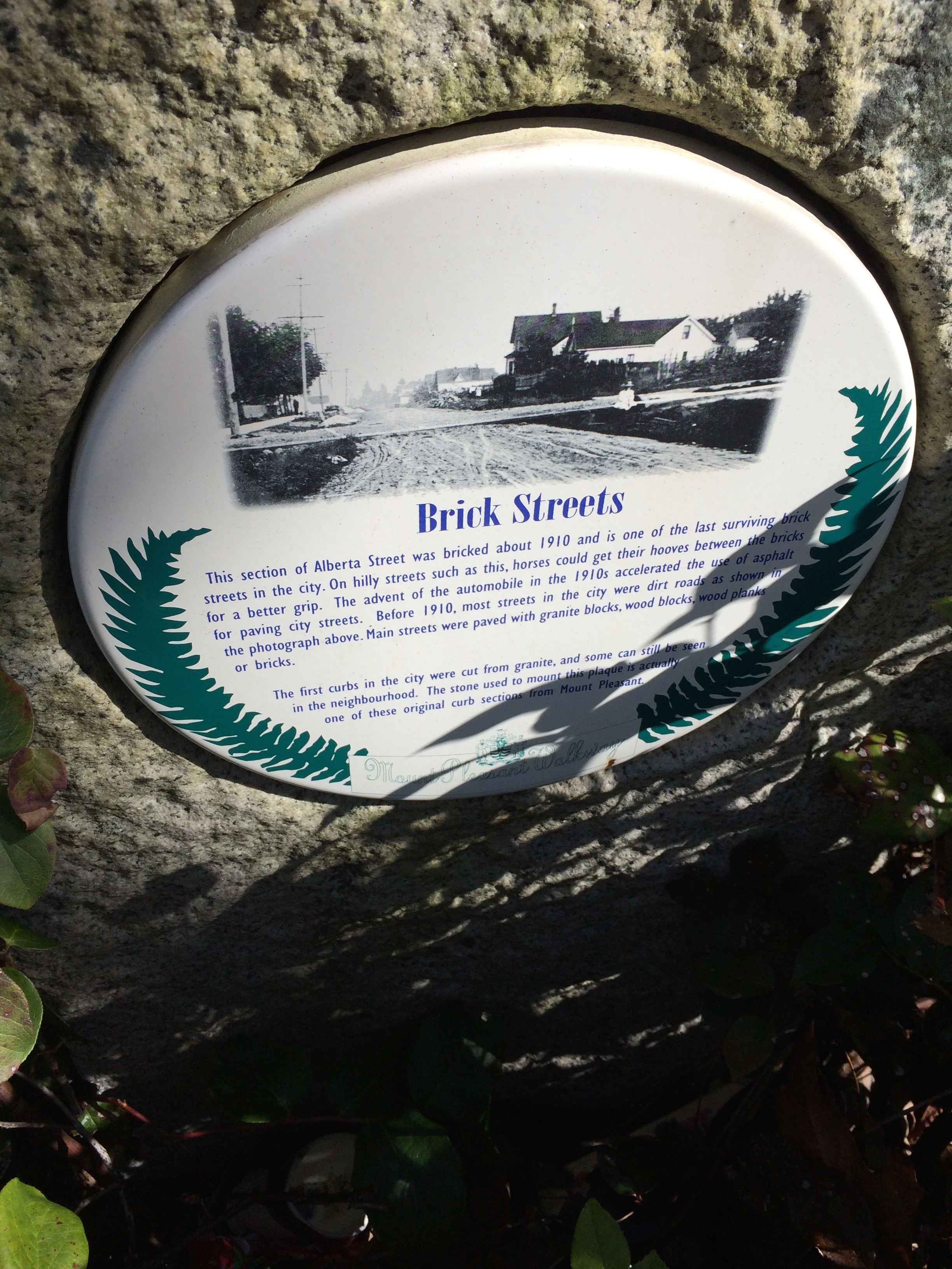 Here’s the text: “This Section of Alberta Street was bricked in about 1910 and is one of the last surviving brick streets in the city. on hilly streets such as this, horses could get their hooves between the bricks for a better grip. the advent of the automobile in the 1910s accelerated the use of asphalt for paving city streets. before 1910, most streets in the city were dirt roads as shown in the photograph above. Main streets were paved with granite blocks, wood blocks, wood planks or bricks.