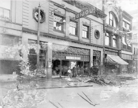 The flood shown in the Archives image turns out to be a 1909 incident which broke rainfall records and caused considerable damage in the town. At the Bijou Theatre, water had entered the building and was cascading down the aisles, causing a panic. It was rumoured that the flood interrupted a performance by Al Jolson.