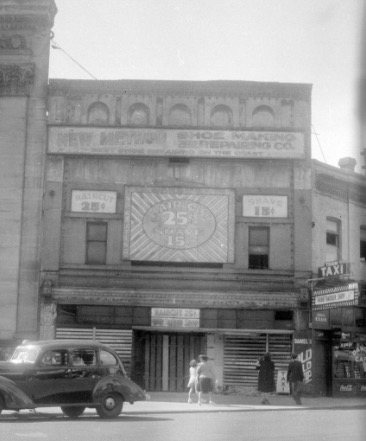 Here’s the Vancouver theatre in a detail from an Archives photo (Str p416) taken in 1908, showing the building next to its neighbour the Louvre Hotel.