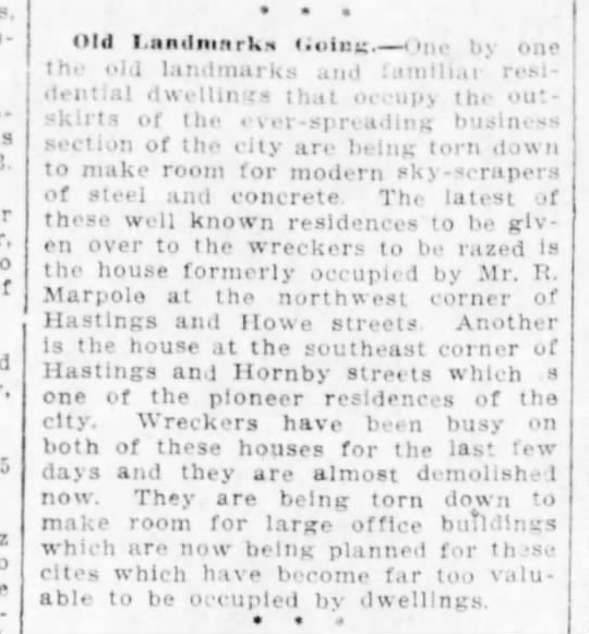 Here’s the Vancouver Daily World in September 1912, reporting on the demolition of Richard Marpole’s house at Howe and Hastings. The image is of the house in 1910 hemmed in by the construction of the Metropolitan Building and the recently completed Winch Building. The image is BU P556 from the Archives.