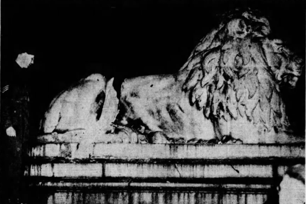 Once put in place they sat there peacefully minding their own business until one evening in November 1942 when two small explosive devices were triggered breaking off the hind quarters of the lion on the west side of the entrance. Newspapers reported that the blast shifted the rear of the lion almost eight inches.