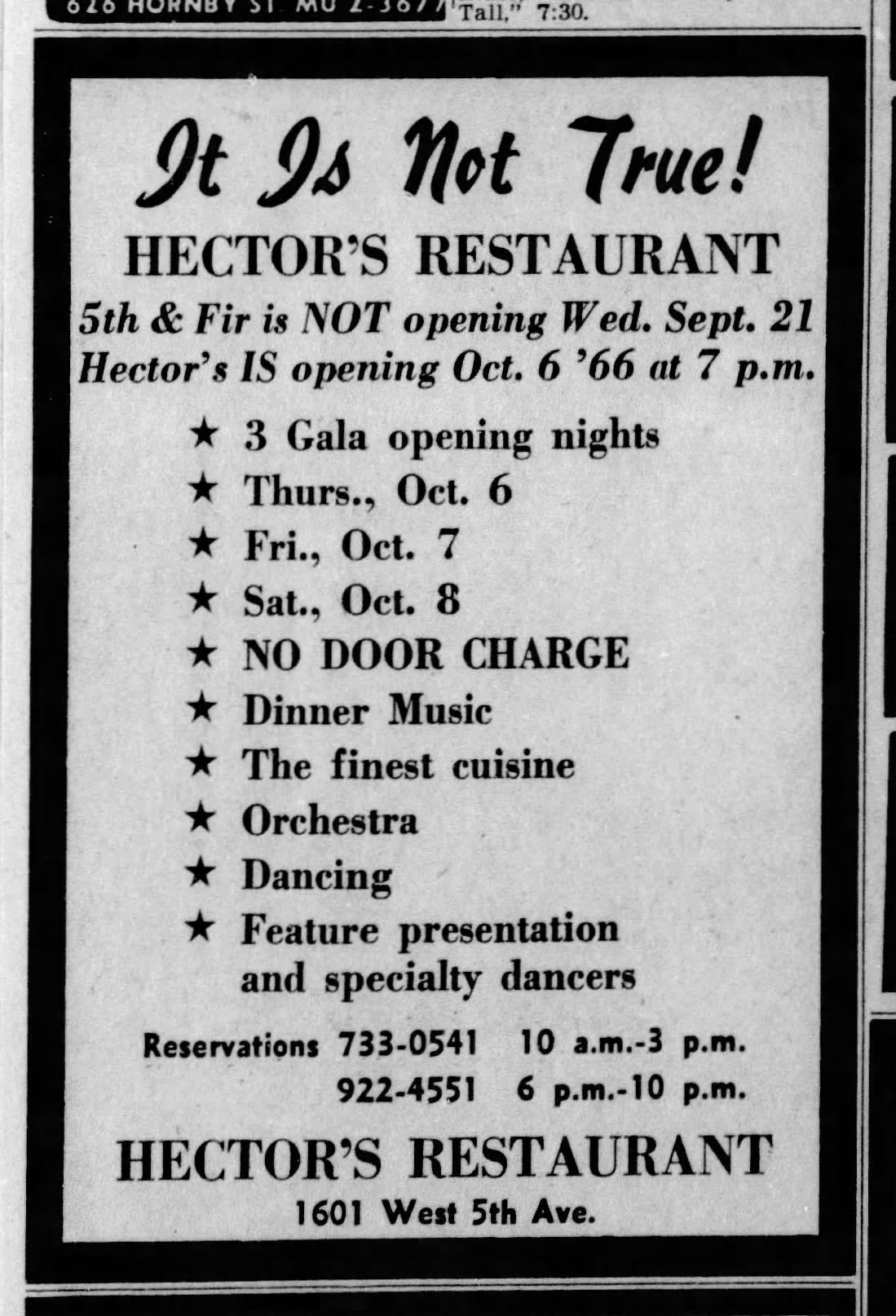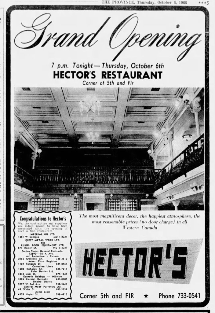 The Province on October 6, 1966, carried an opening day advert for Hector’s which showed off the interior which looked rather interesting with it’s balconies and coved ceiling.