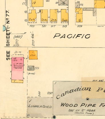 Given the presence of the CPR in the neighbourhood it seems surprising that the Quarters would have been such a short lived entity. Turns out the company was constructing purpose-built accommodation for its staff at the foot of Seymour on Pacific Street. The two storey building on the south side of Pacific next to the Canadian Wood Pipe Company’s plant looked like a small apartment house and shows up in newspapers with different names including the Porter’s Bungalow, CPR Bunkhouse, Porters’ Boarding House and the CPR Conductors Quarters. So 1227 Richards was a stop-gap measure while the new accommodation was being built on Pacific Street.