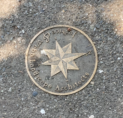 If you walk up to the top end of the path along the green space next to Gore between Keefer and Union Street you̓ will find a bronze plaque set in the sidewalk with a compass rose ringed with Justice and Webb Landscape Architects. Standing there and looking south it̓s hard to imagine that this green space was designed by one of the most important landscape firms in the city.